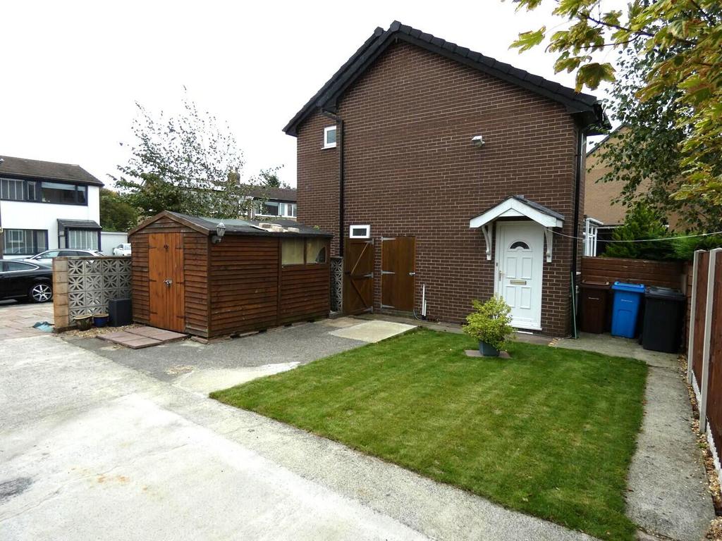 Exterior - A paved front exterior frames this well-maintained property with a compact tree and a low garden wall, offering ample space for parking or outdoor activities. The neat fencing and garden shed add practical outdoor storage solutions, while the modest lawn adds a touch of greenery in an otherwise paved area. Integral Utilty/ Storage Cupboard provides an ideal space for a plumbed in washing machine.