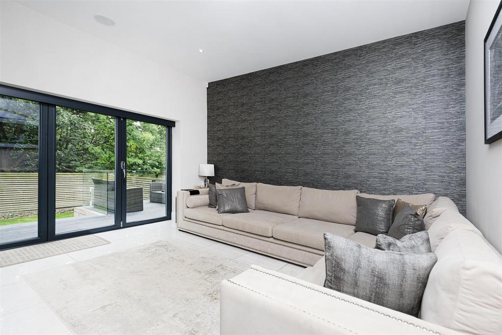 Lounge - 4.47m x 3.76m (14'8" x 12'4") - Modern media wall unit, bi-fold doors, tiled floor.