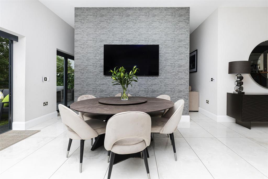 Family Living Kitchen - 8.23m x 7.19m (27' x 23'7") - The kitchen area is fitted with a range of modern wall and base units incorporating quartz work surfaces, integrated fridge/freezer, dishwasher, wine cooler, hot tap, microwave, 2 X double ovens, hob, tiled floor. The dining area has a bi-fold door to rear garden.