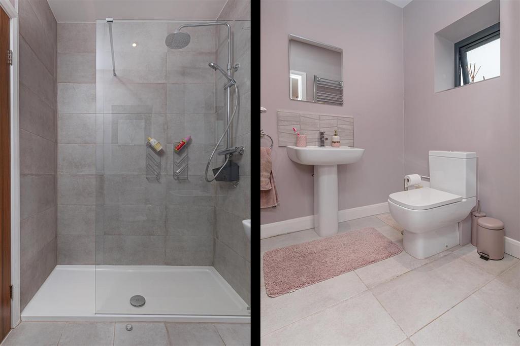 En Suite Shower Room - Modern three piece suite comprising walk-in shower, low suite wc, pedestal wash basin, tiled walls and floor.
