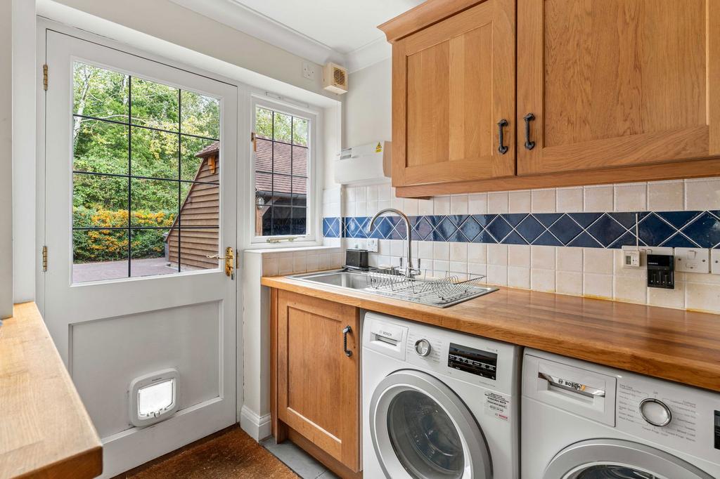 At the heart of the home lies the stunning 31ft. kitchen/breakfast room, designed with both style and practicality in mind. Generously proportioned, it features a central island with breakfast bar, granite worktops, and handcrafted luxury cabinetry housing a range of integrated Neff appliances. Underfloor heating adds to the comfort, while French doors lead out to the garden, an ideal space for summer gatherings. A well-planned utility room sits just off the kitchen and provides direct access outside.