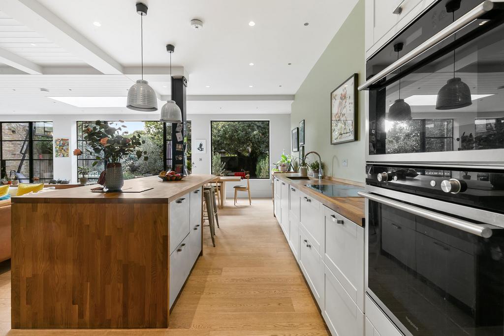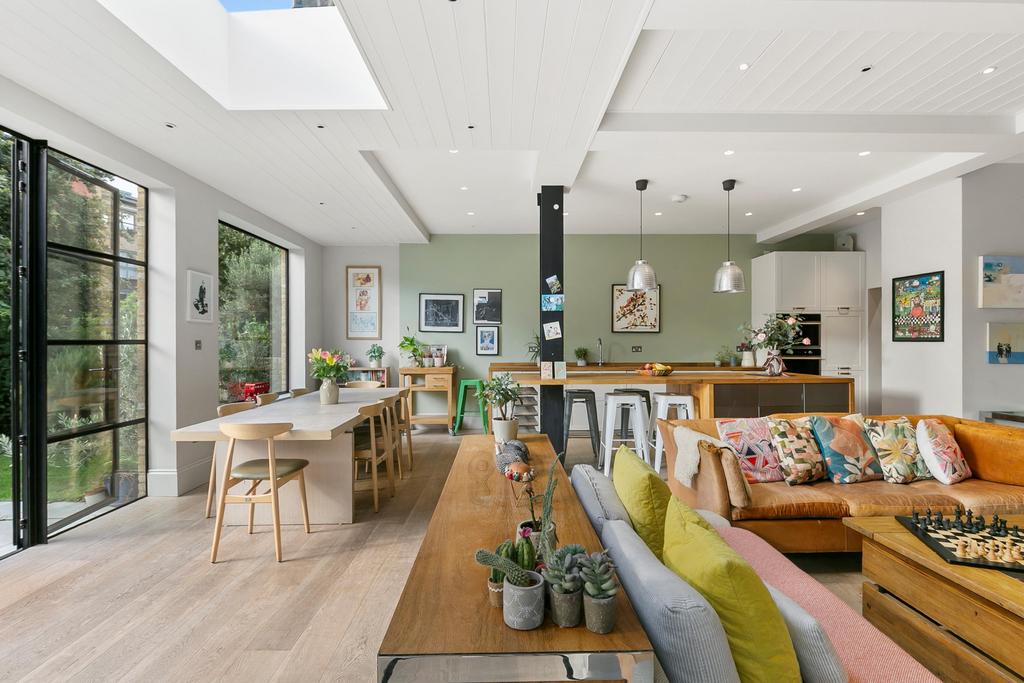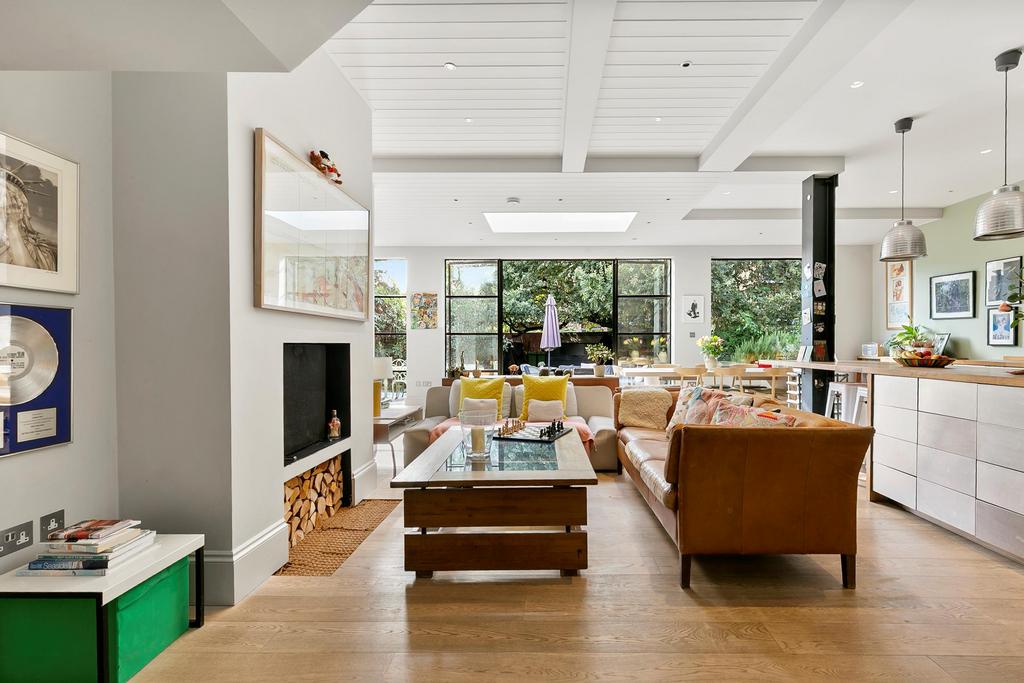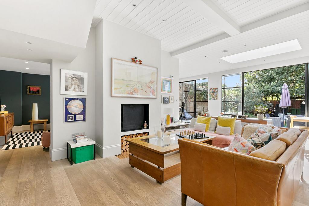 The house offers exceptional living and entertaining space, blending period charm with modern functionality. A key feature is the expansive, open-plan kitchen, dining, and living area measuring an impressive 38'1 by 25'3. This light-filled space forms the heart of the home, with a central feature fireplace and full-height glazed sections that open directly onto a stunning west-facing garden. The garden, extending 56'3 feet and surrounded by mature walls, offers a private and tranquil outdoor setting that captures the afternoon and evening sun—ideal for both family life and entertaining.