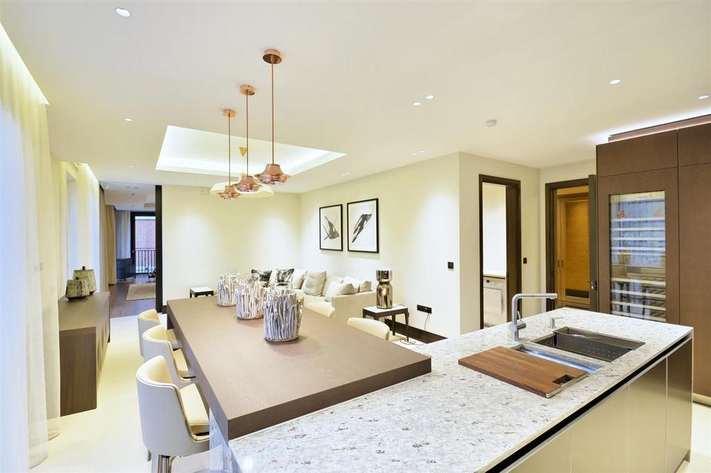 This unique first floor, 3 bedroom apartment provides a grand entrance hall, formal reception, substantial kitchen with informal dining and master bedroom with luxurious en suite and walk-in wardrobe. There are a further 2 bedrooms with en suite shower-rooms, a utility room and generous storage. The kitchen is by Bulthaup with top of the range integrated Gaggenau appliances and the highest quality marble, porcelain and timber throughout.