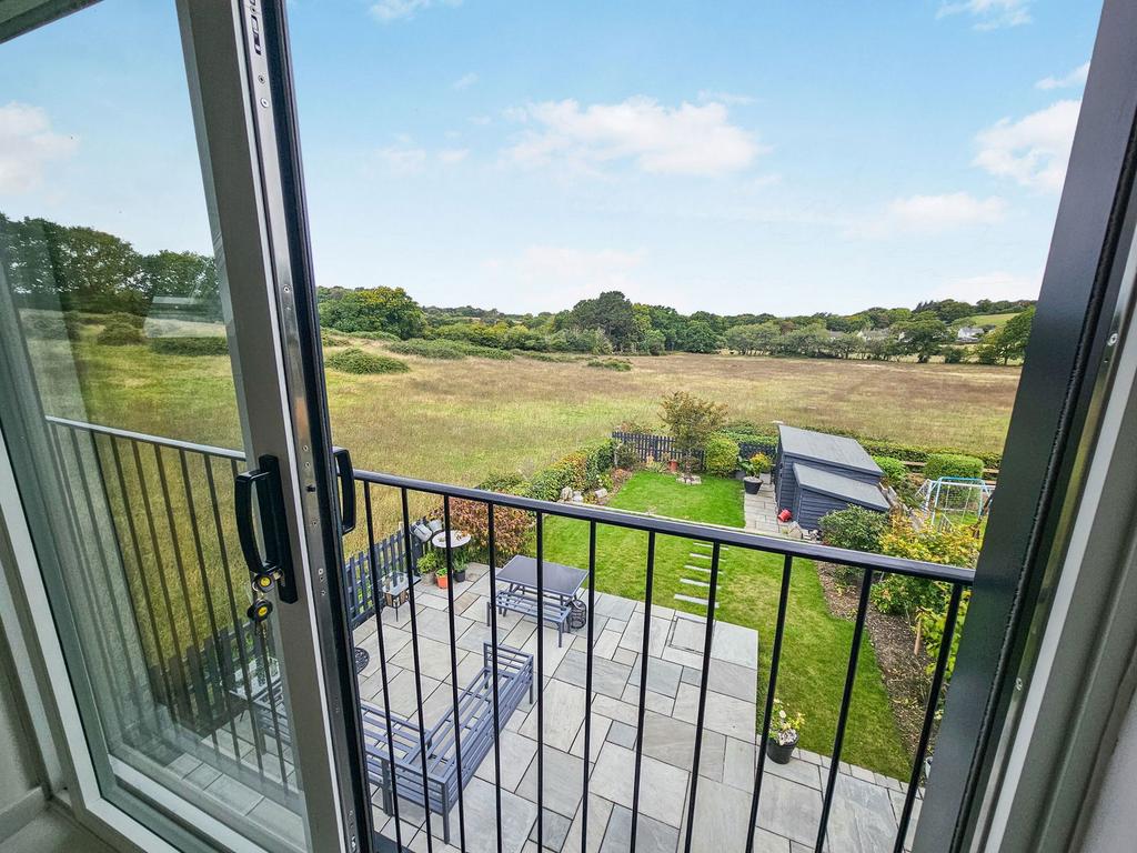 Upstairs, the standout feature is the vaulted master bedroom. Light-filled and elevated, it comes with fitted wardrobes, a spacious ensuite shower room and its own Juliet balcony with uninterrupted countryside views. There’s a split-level landing leading to two further bedrooms and a smart family bathroom.