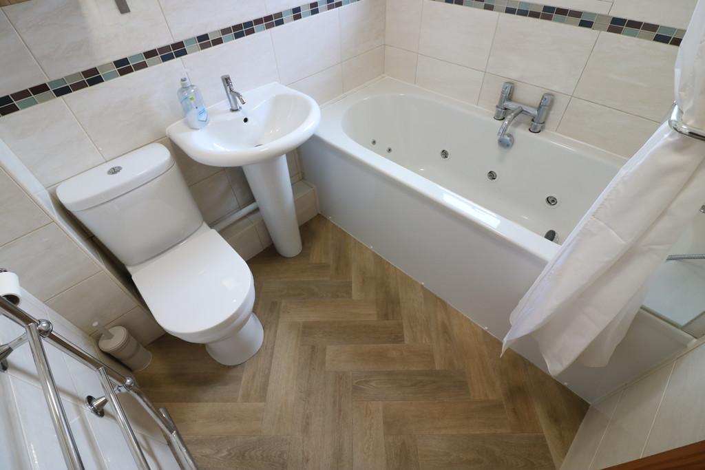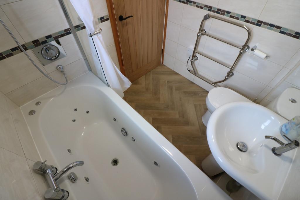 STYLISH BATHROOM with jacuzzi style bath with SHOWER over, W.C, wash hand basin and heated chrome towel rail.