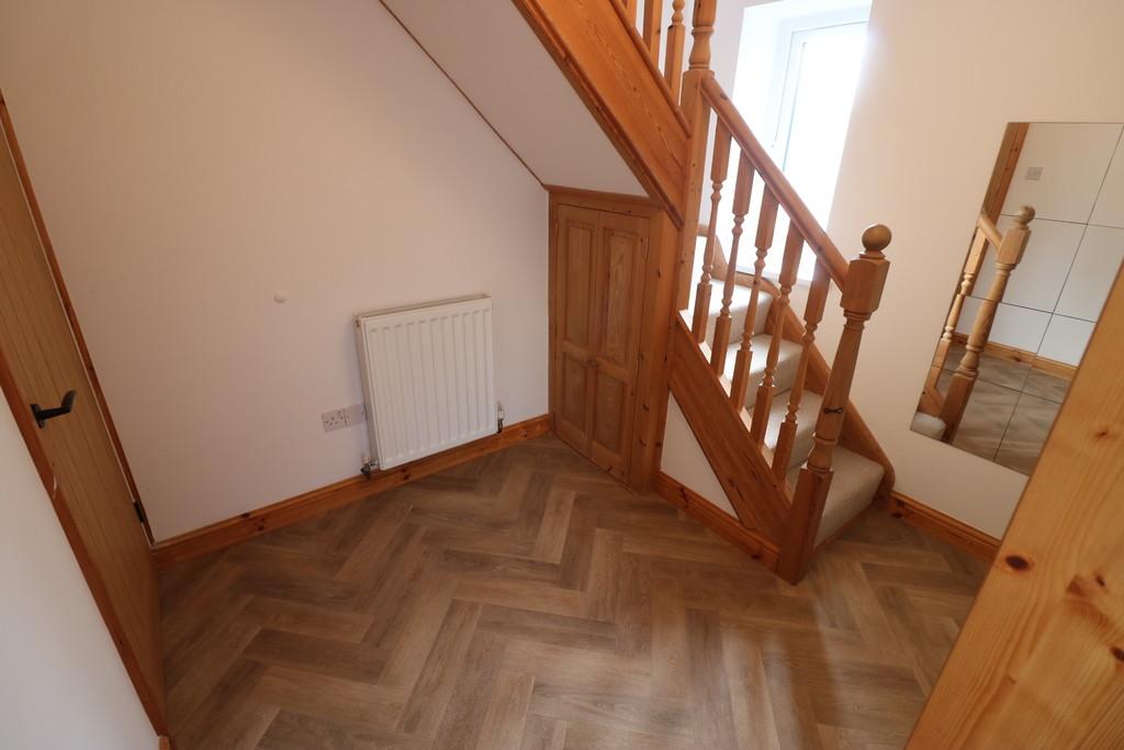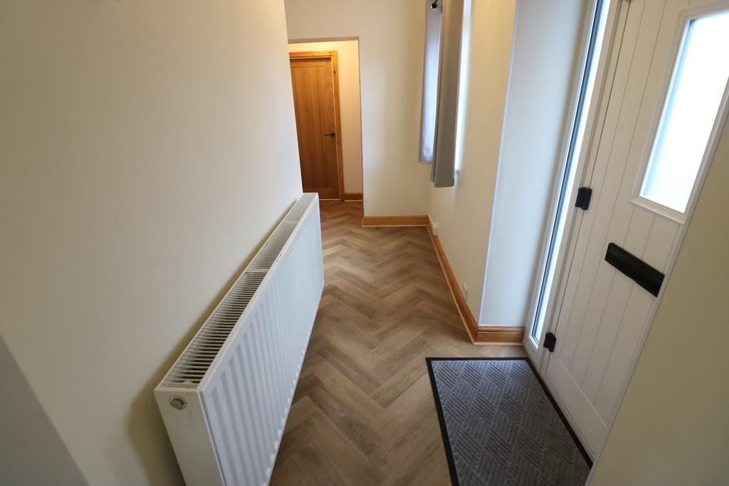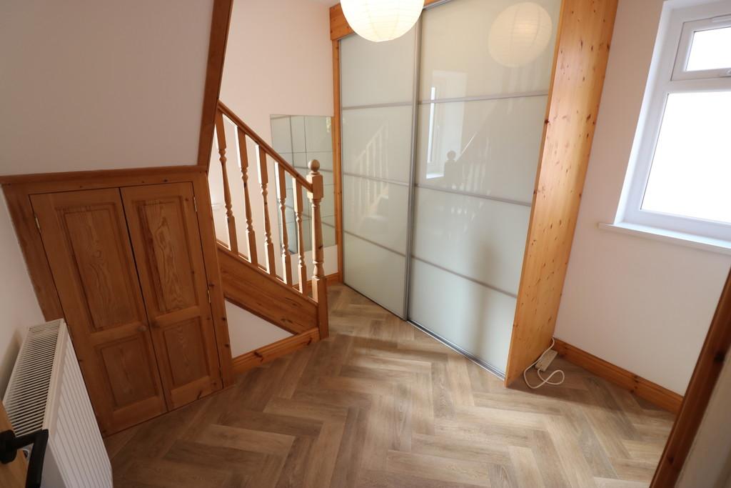 Entrance into a welcoming hallway with wood effect vinyl flooring.