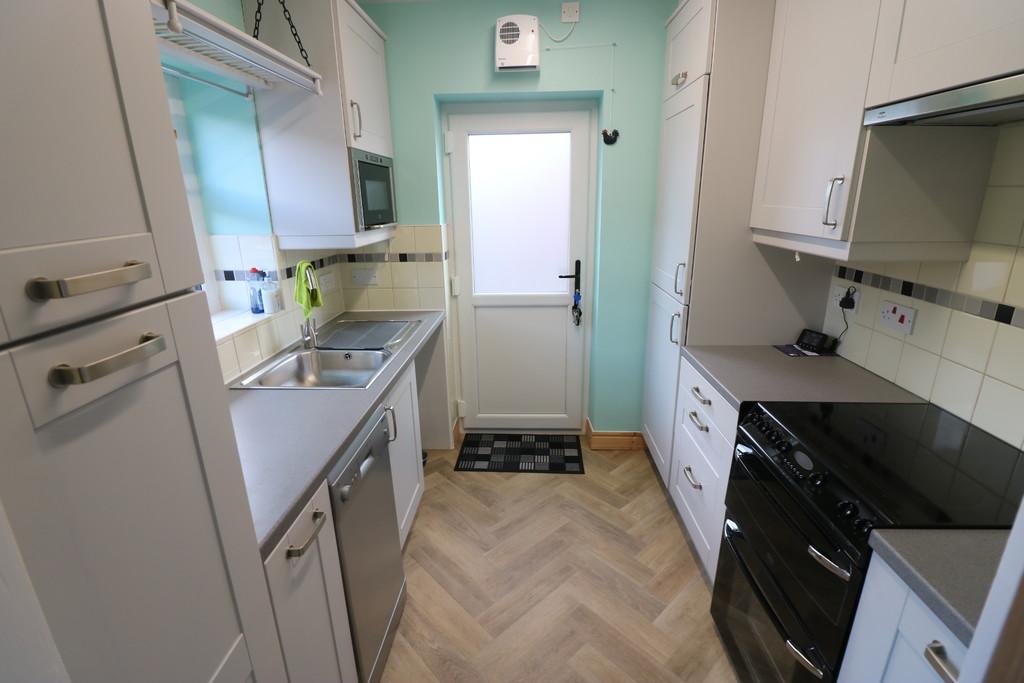 Fully fitted galley style KITCHEN with grey colour fronted wall and base units, contrasting worktops, electric cooker, FRIDGE/FREEZER, DISHWASHER and microwave.