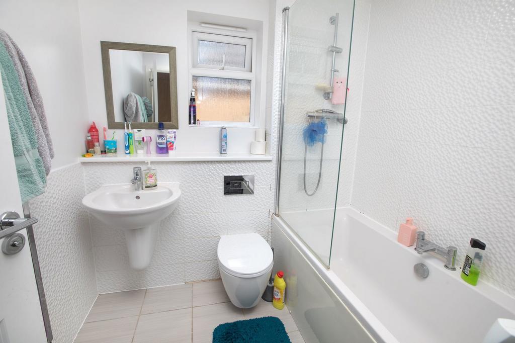 The bathroom includes a side panel bath with screen and shower, semi pedestal wash hand basin and a wall hung WC with ceramic tiled wall surrounds.