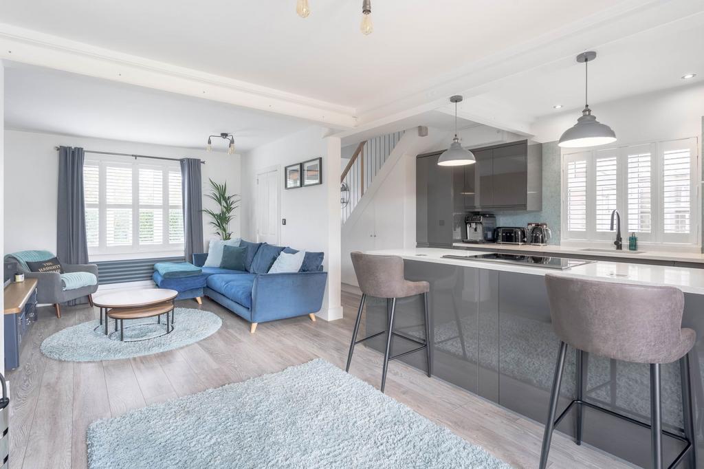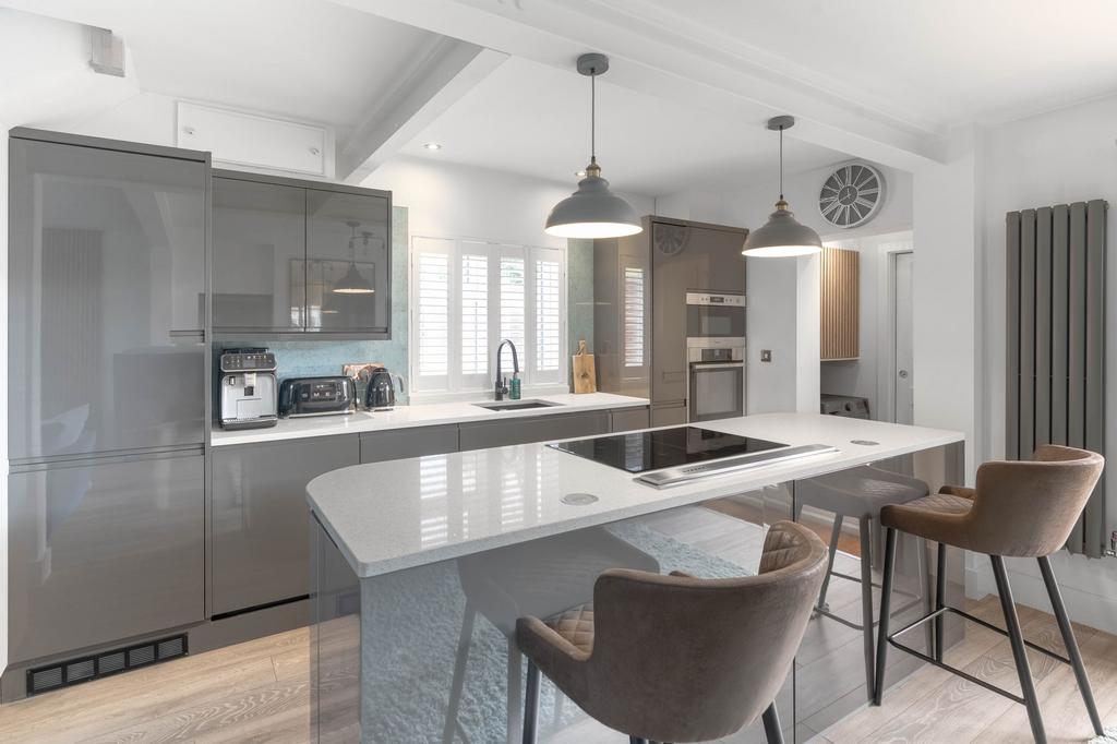 Leading into the property via the entrance hall, which includes a range of bespoke storage cupboards/drawers, a contemporary oak staircase which leads to the first floor. The impressive open plan kitchen/dining/area is both well-planned, modern and a stylish space, comprising a comprehensive range of wall and base units in a grey gloss finish with quartz worktops and integrated appliances, a popular island provides seating and fruit storage, plus houses the induction hob, with an anthracite grey radiator and open plan to the dining area. A separate utility area provides space for the washing machine and tumble dryer and leads to the attractive, modern ground-floor shower room, which features a wetroom-style walk-in shower cubicle and high-quality fittings. Offering access to the garden via French doors and a log burning stove, and open plan to the cosy sitting area, with acoustic wood panelling featured in both areas.