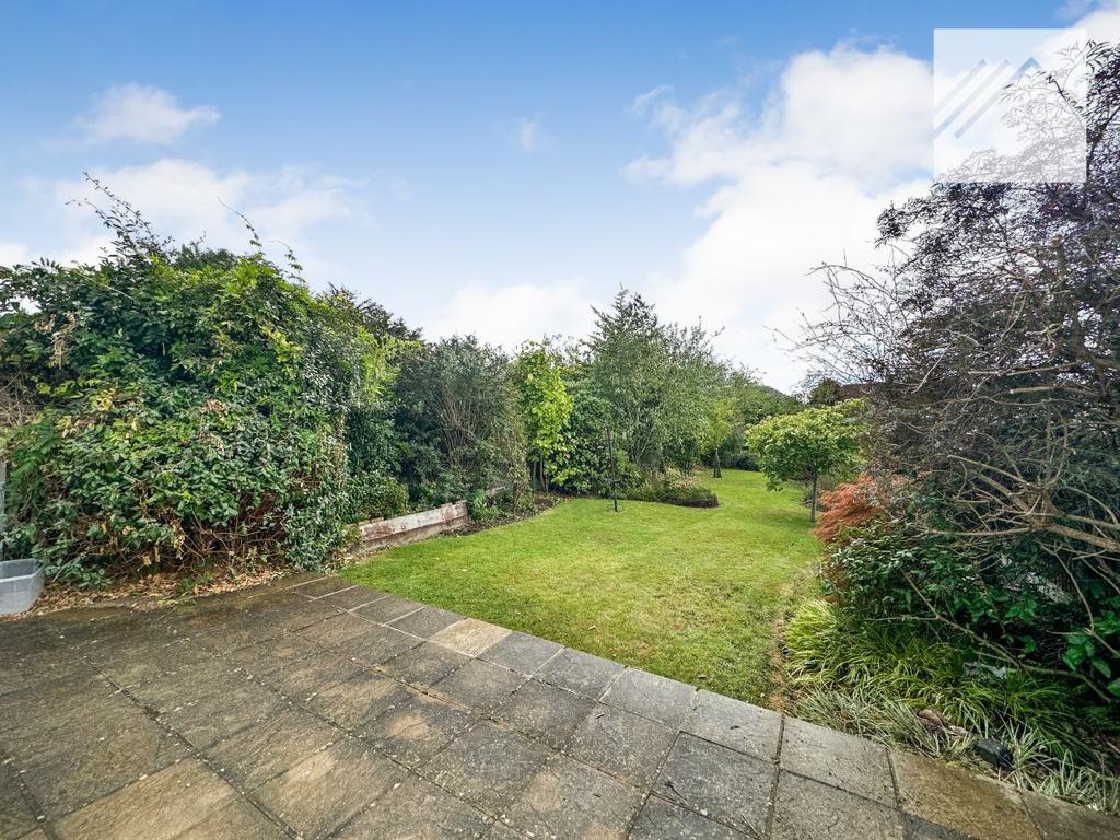 The rear garden commences with a paved patio, leading to the expansive lawn with various flower and shrub borders