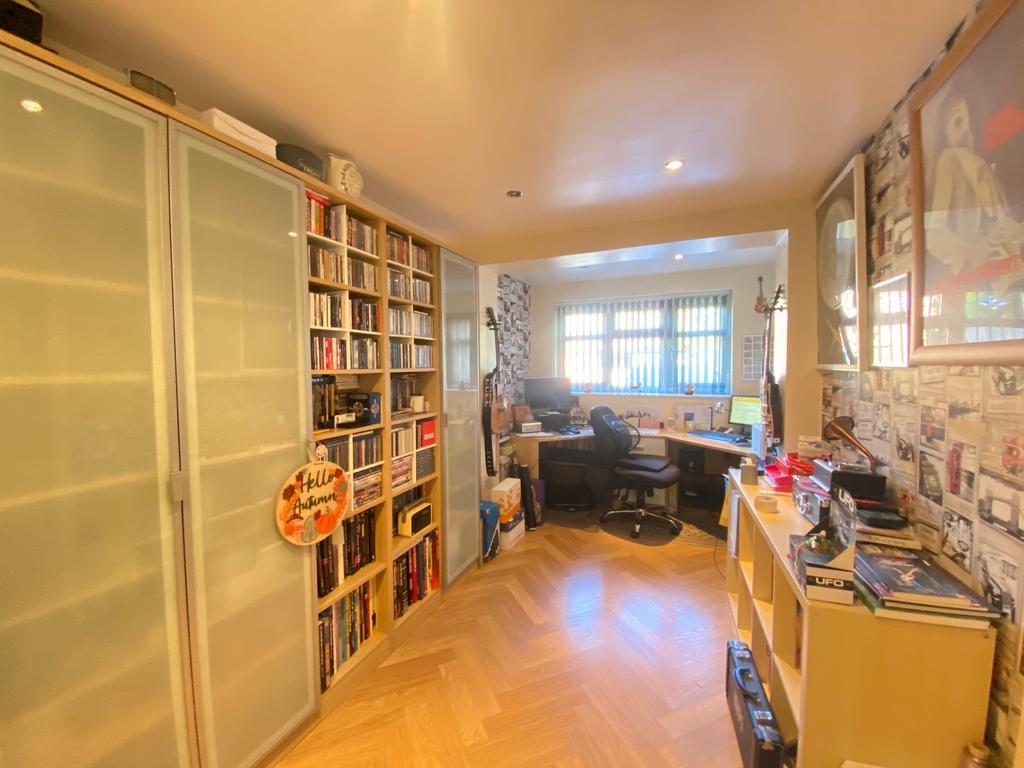 Versatile and spacious room currently set up as a home office having a uPvc double glazed panelled window to the front elevation, laminate flooring, double panelled radiator, inset spot lighting, decorative single glazed arched window looking back into the reception hall.