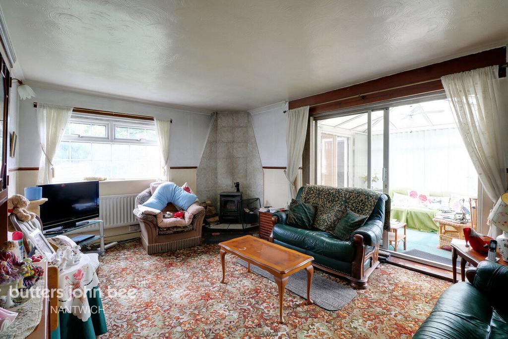 Offering wide burning stove on tiled hearth, two radiators, two wall lights, TV aerial point and sliding patio doors to conservatory.