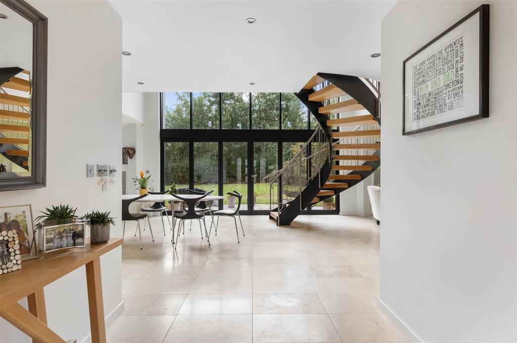 Mere Barn Farm is a truly unique residence – a bespoke-built, contemporary home of architectural distinction, set within a mature one-acre plot and designed to make the very most of its idyllic setting. Constructed in 2013 by a specialist builder and now an award-winning property, the house has matured beautifully, combining timeless elegance with a bold modern form. Its half-hexagon design harmonises perfectly with the landscape, opening up a sunny south-facing aspect across Welford on Avon Golf Course.