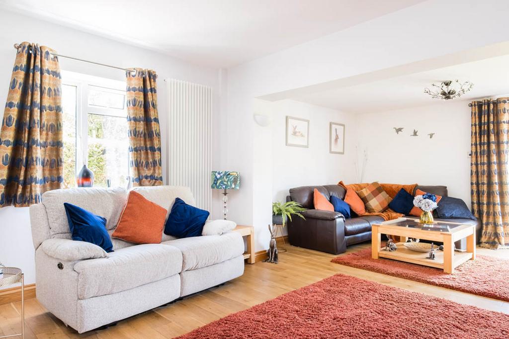 At the other end of the property is the sunning, two-part sitting room: a large space divided via an arch, creating two spaces - a TV lounge with a feature wall and an entertaining snug with a cosy fireplace and French doors leading out to the rear garden.
