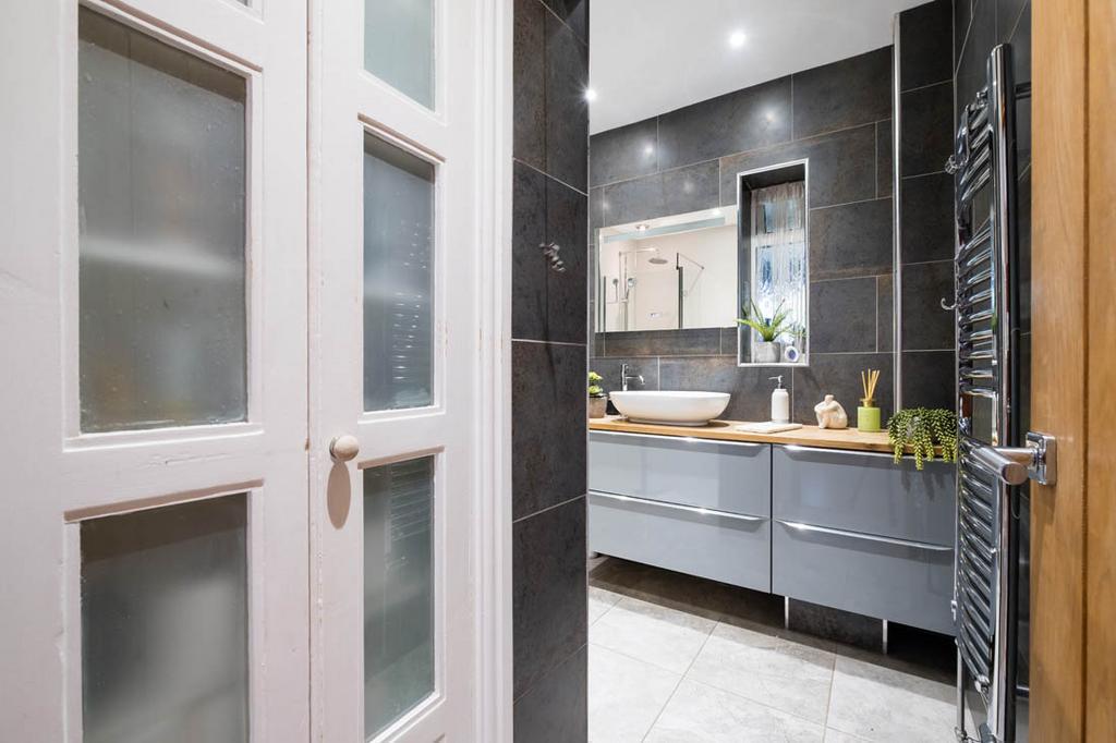 There is an elegant ground floor shower room with beautiful floor-to-ceiling tiling, attractive built in sink basin vanity unit with storage drawers, WC and a large shower enclosure.