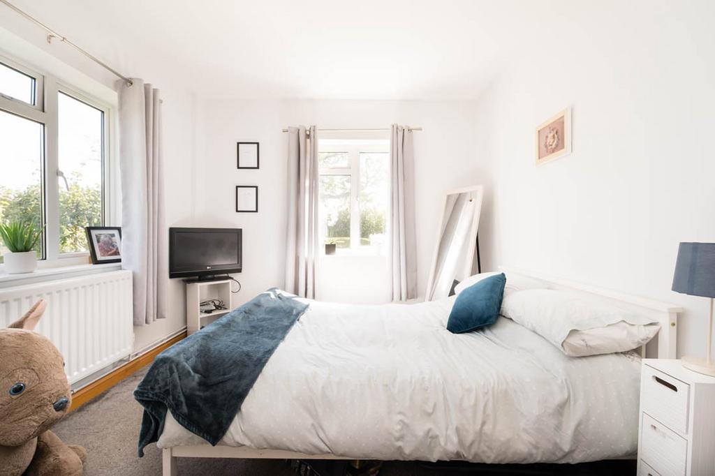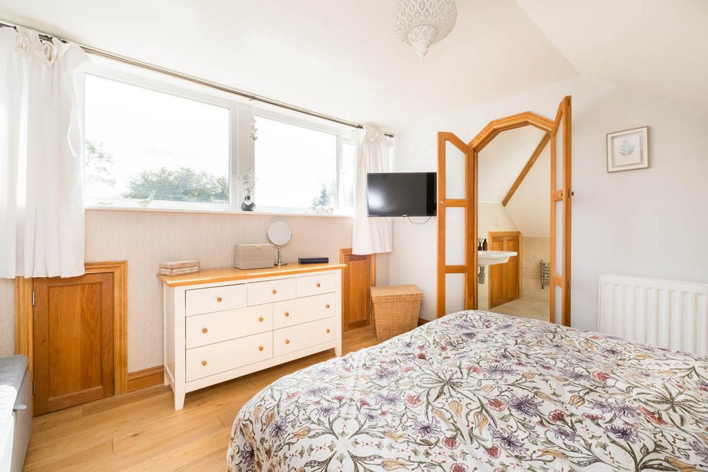 Upstairs, the landing is well-lit, courtesy of a Velux window and is currently utilised as a home office; there is also plenty of built-in cupboard storage: perfect for storing Christmas decorations and suitcases. The master bedroom sits to the side and overlooks the front garden; attractive glazed doors access the attendant en suite which has a sink, WC and walk-in shower cubical.