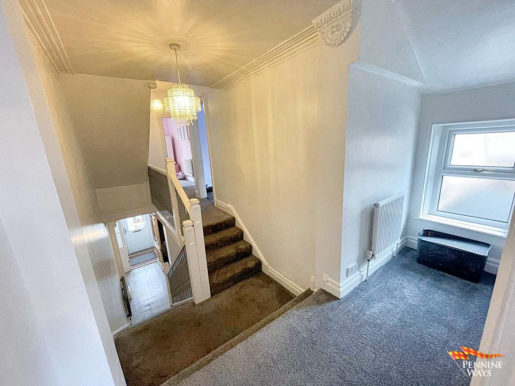 Large landing with steps up to the bathroom and bedrooms, wood banister, radiator, UPVC double glazed window and carpet flooring.