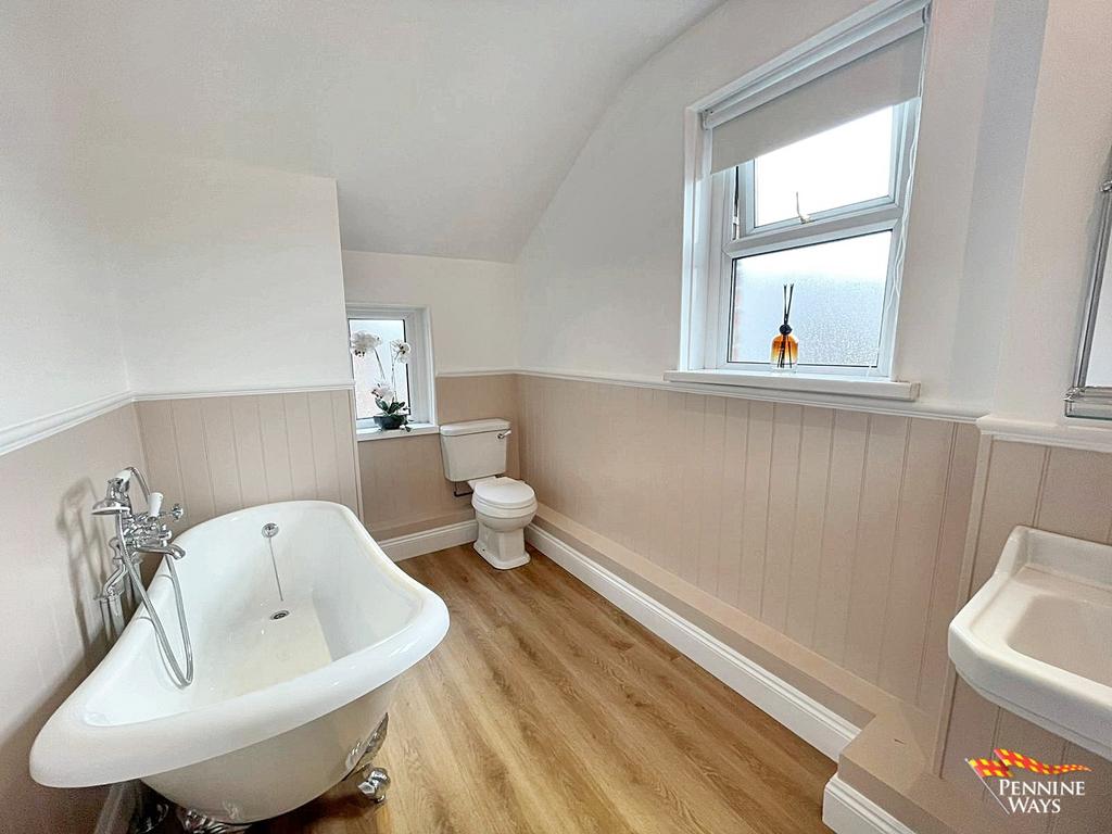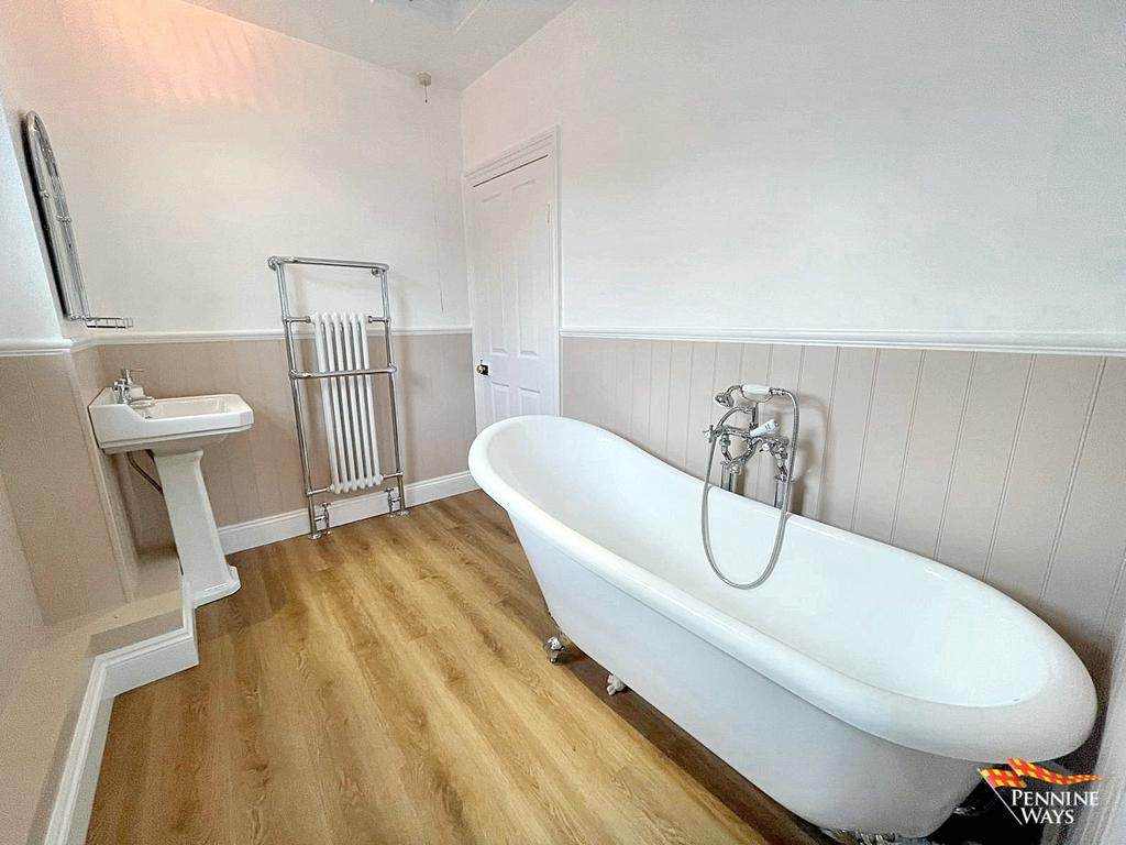 Master bathroom with featured rolltop bath, pedestal sink and WC, storage, Victorian radiator, half panelled walls, loft hatch, wood door and laminate flooring. Two UPVC double glazed windows.