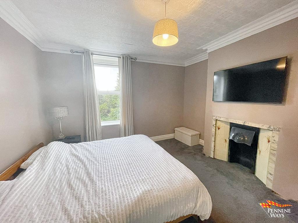 Master double bedroom with carpet flooring, cast iron fireplace, coving, UPVC double glazed, radiator and wood door.