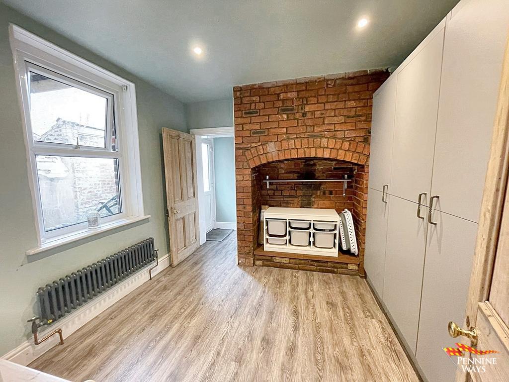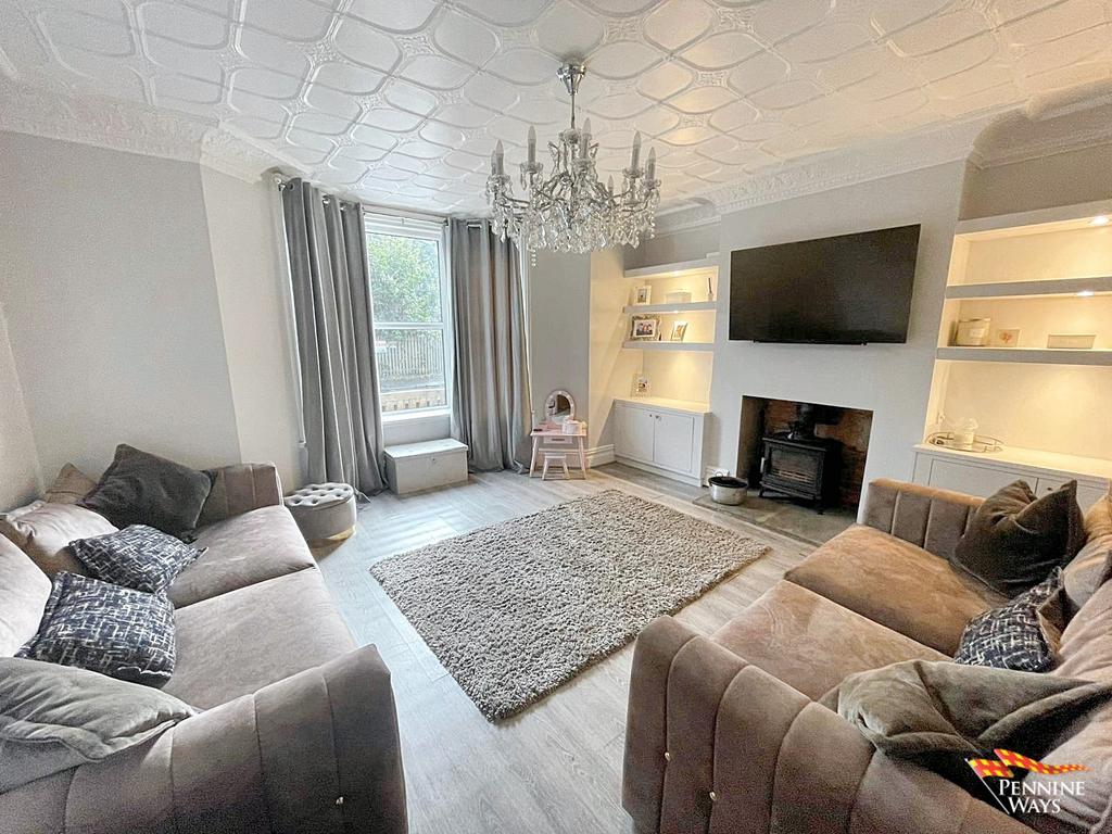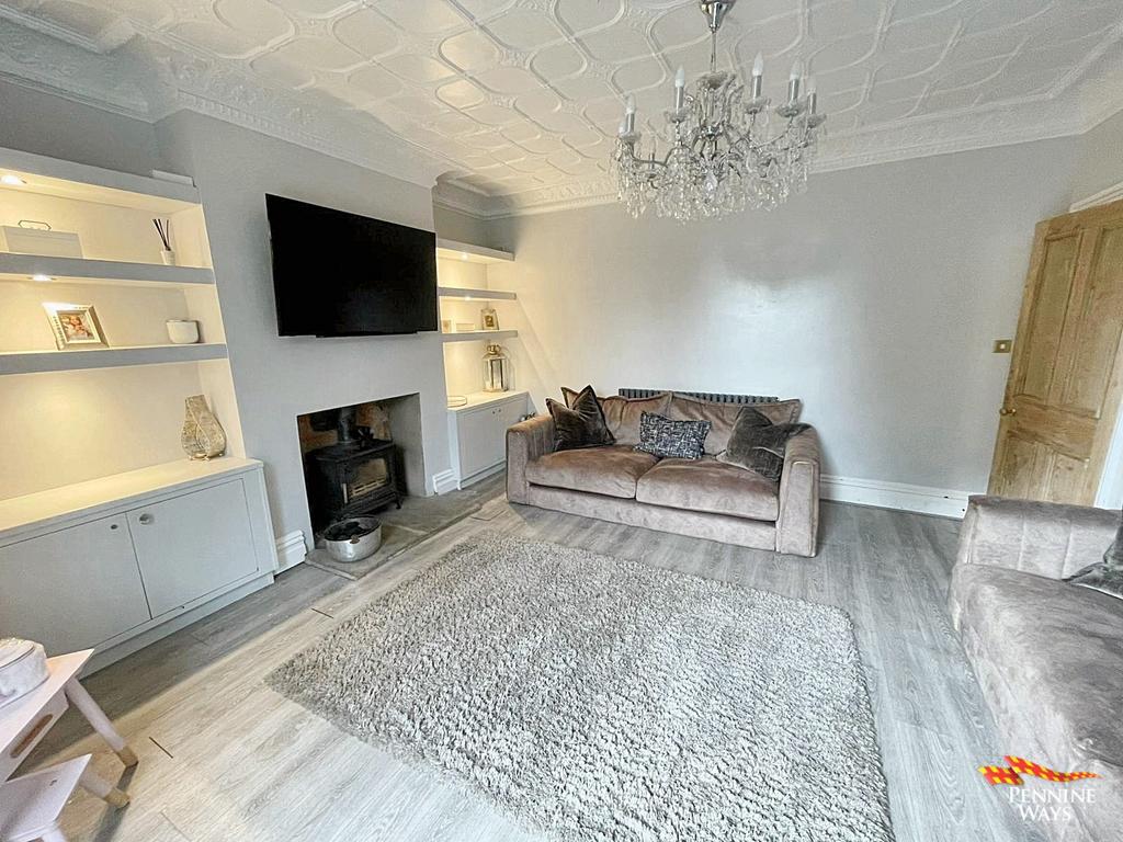 Expansive living space having a traditional multi fuel burner, built in wood storage, ornamental ceiling & coving, wood door, beautiful bay double glazed UPVC window, laminate flooring and Victorian style radiator.