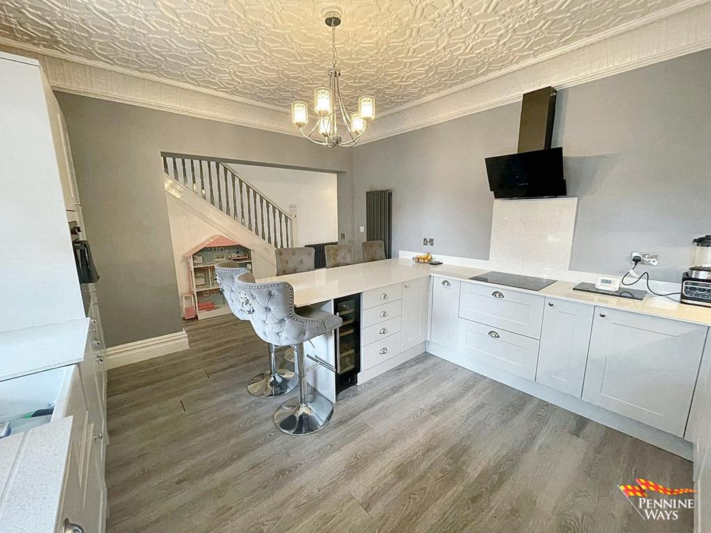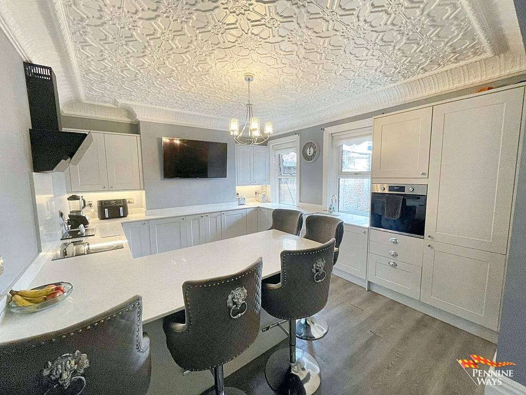 Well-equipped Peninsula kitchen with shaker cabinets, integrated white goods, sunken Belfast with built in drainer, cooker splashback, breakfast bar and plumbing for washing machine. Laminate flooring, ornamental ceiling & coving, Victorian wall radiator and two double glazed UPVC windows.