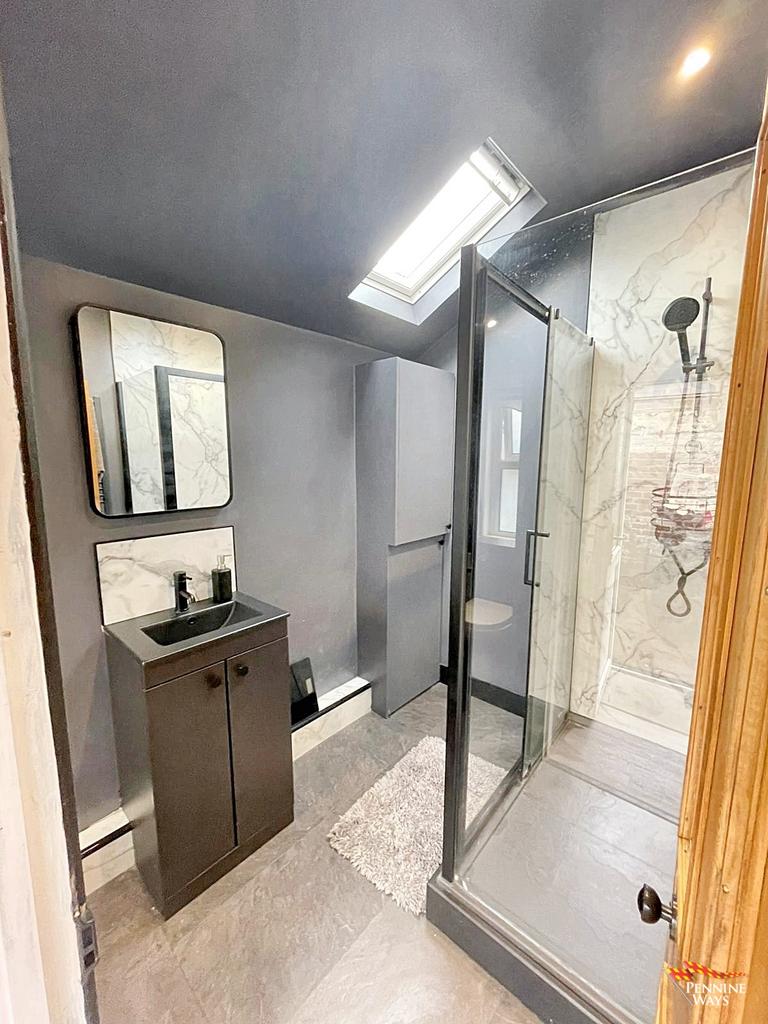 Modern downstairs shower room having large walk-in-shower, WC and vanity sink. Houses Baxi boiler, tiled flooring, towel rail, wood door, UPVC double glazed window and Velux window.