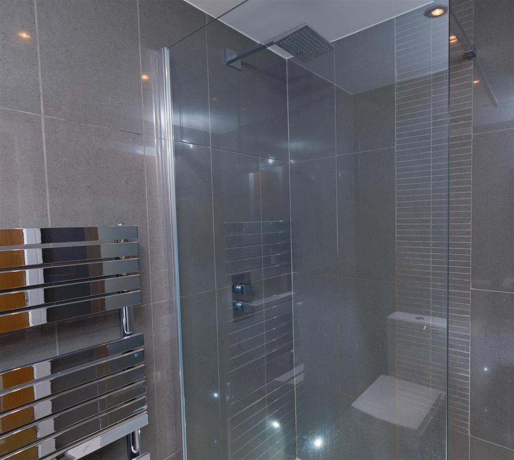 Ensuite - 2.21m x 1.47m (7'3" x 4'10") - The fully tiled ensuite comprises a contemporary white suite including a semi pedestal wash basin, low flush wc and large walk in shower. Heated towel rail and down lighters.