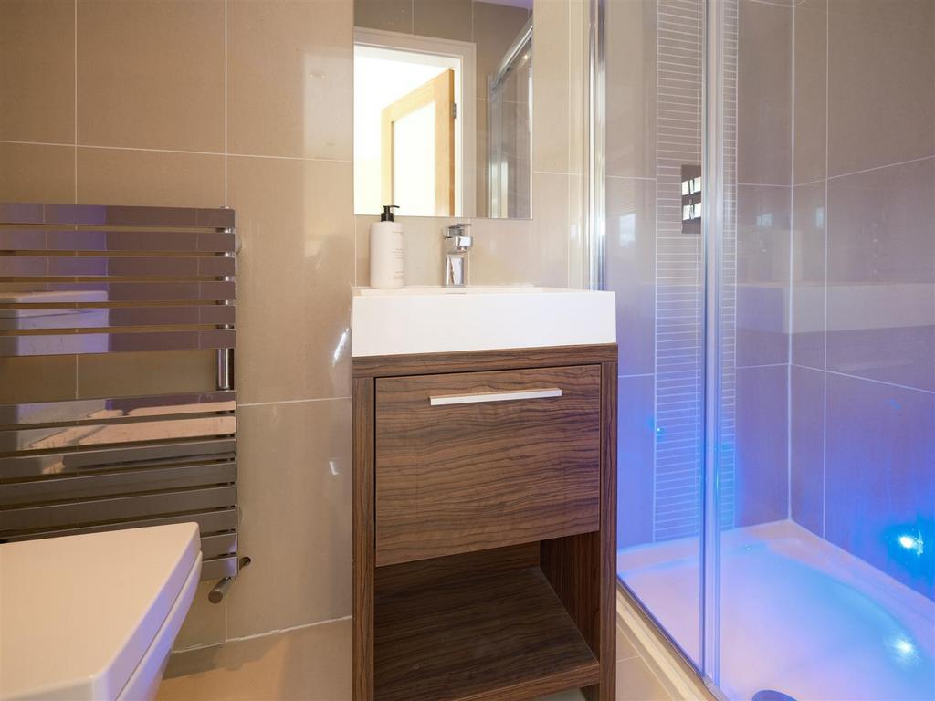 Ensuite - 2.34m x 0.99m (7'8" x 3'3") - A fully tiled ensuite comprising a white low flush wc, wash basin in a vanity unit and shower cubicle. Heated towel rail and down lighters.