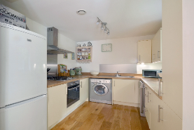 Kitchen: White wall units with wooden laminated worktop and stainless steel splashback. Freestanding appliances in good condition with a gas hob. Wood laminated flooring.