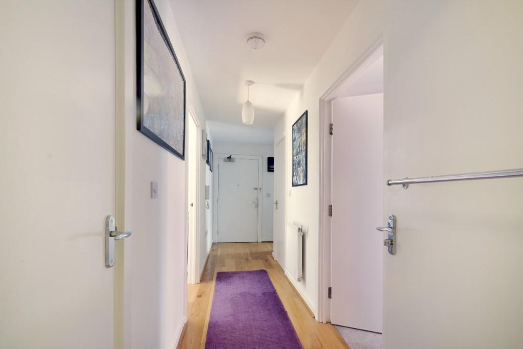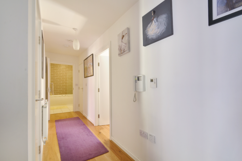 Entrance: Hallway with phone entry phone system. Wood laminated flooring.