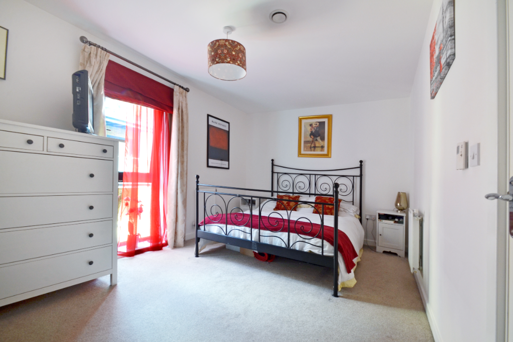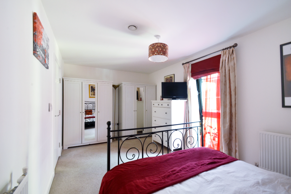 Bedroom 2: Double bedroom with floor to ceiling windows. Beige carpet flooring.