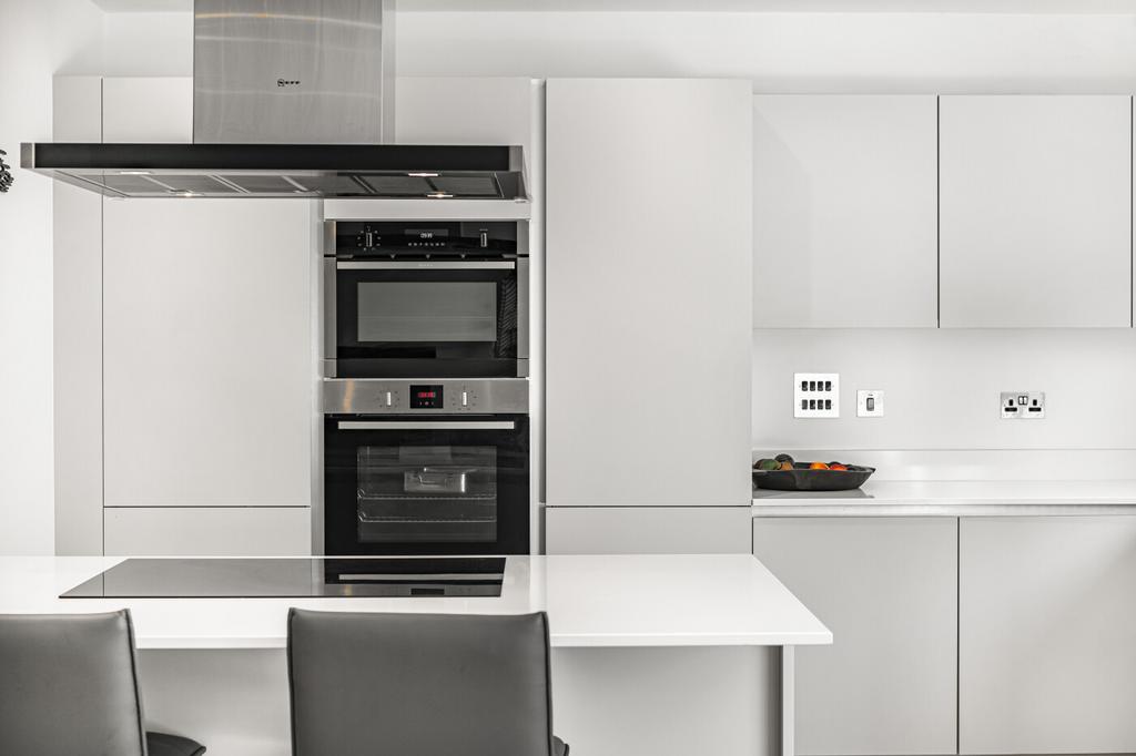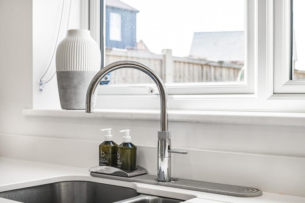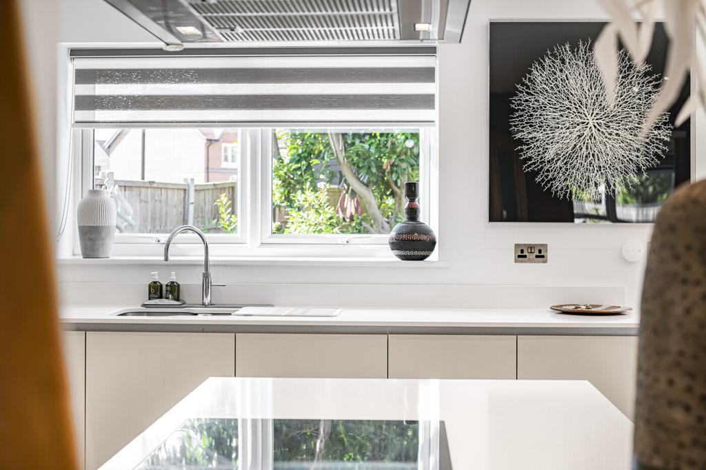 The kitchen comprises modern fitted white gloss wall and base units with a quartz worktop. A breakfast bar has space for 2 or 3 stools beneath, and leads around to the built-in induction hob with stainless steel extractor hood over. Integrated appliances include a full-size fridge and full-size freezer, a dishwasher, and a pair of Neff ovens - one a microwave steamer and oven, the other a grill convection oven. The stainless steel 1 1/2 bowl sink features a Quooker instant hot water tap, and sits beneath a window overlooking the rear garden. A water softener is a useful addition, given the local hard water.