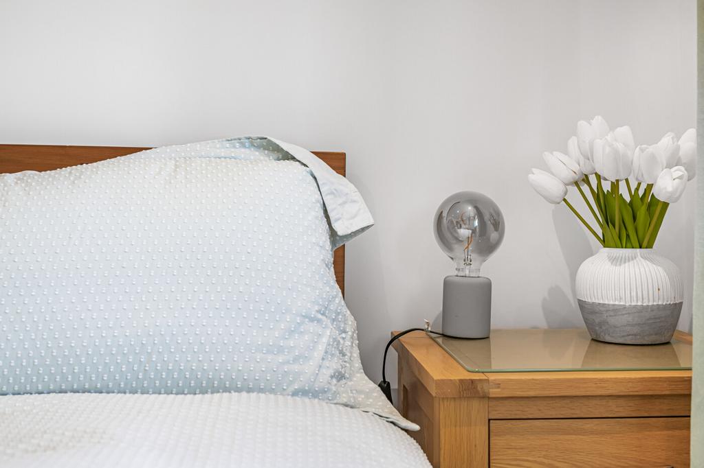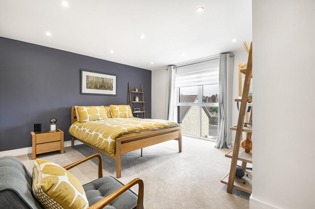 The principal bedroom is a generous carpeted double bedroom, with wall-to-wall built-in wardrobes, a frosted glass Juliet balcony overlooking the rear garden, and an en suite shower room. This 2-tone tiled room features a walk-in shower with a hand wand attachment, a heated towel rail, a wash hand basin set into a drawer unit, a mirrored wall cabinet and a 'floating' w.c., with a window.