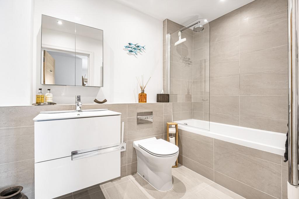 The family bathroom features a tiled enclosed shower bath, with shower over, a wash hand basin set into a drawer unit, a mirrored cabinet, a w.c. and a heated towel-rail.