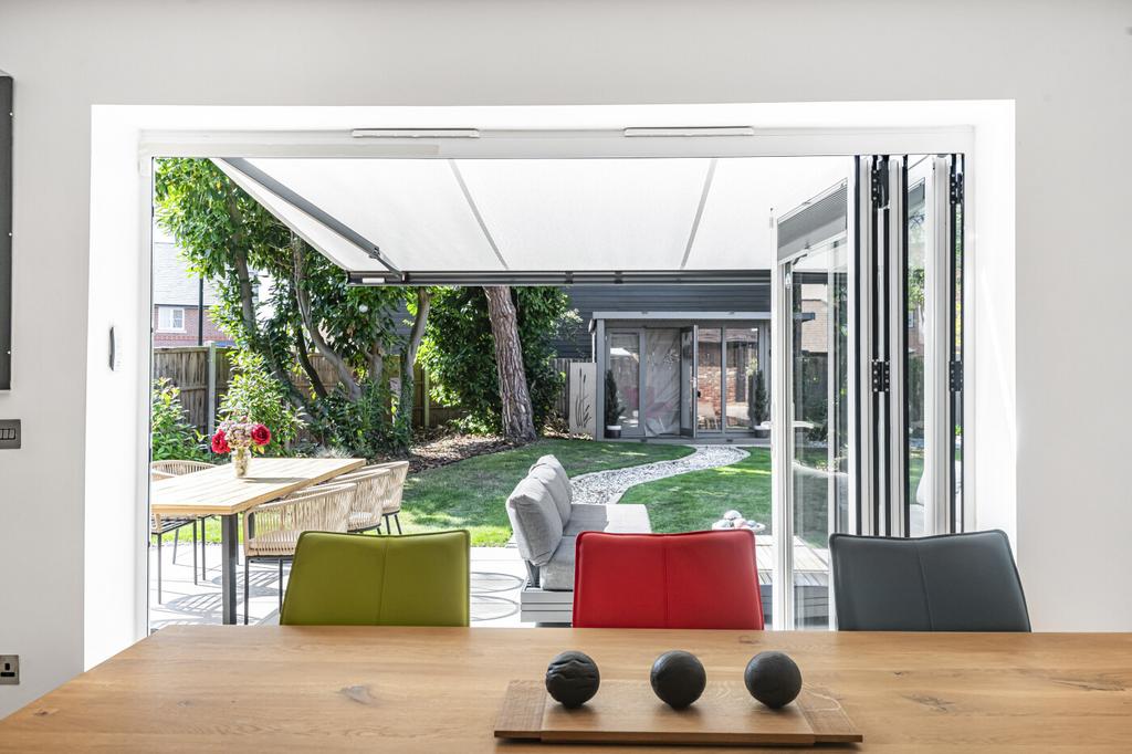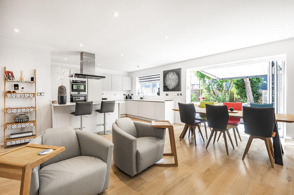Into the lounge, which is a comfortable reception space with wooden floors, a full-height double window to the front with fully integrated 'Seamless Lexiflux' blinds fitted, and a built-in German 'Hülsta' custom entertainment unit featuring LED lighting, shelving and cabinets. Glazed internal doors lead through into the large open-plan kitchen / living space. This is a dramatic and light-filled room with a southerly aspect, with ample space for a comfortable sitting room area, and space for an 8-10 seater dining table next to the kitchen.