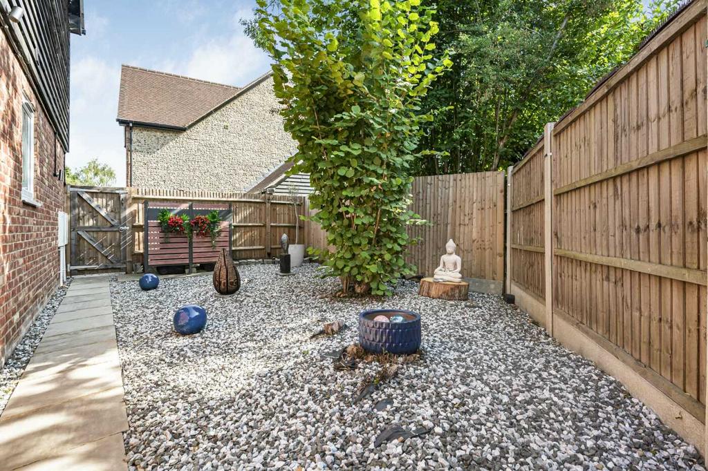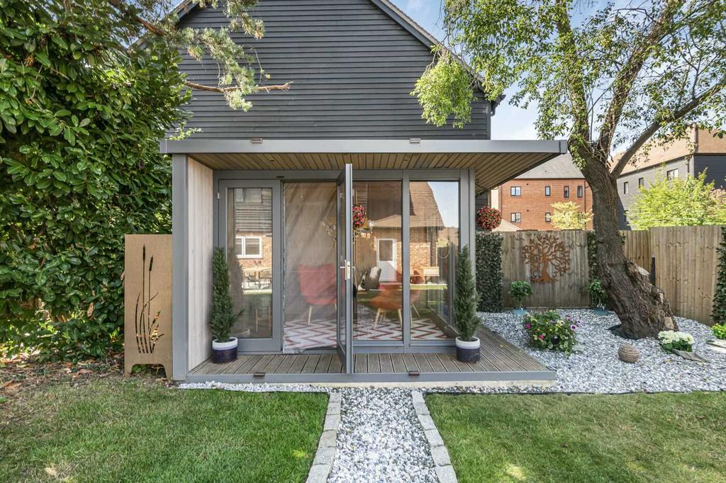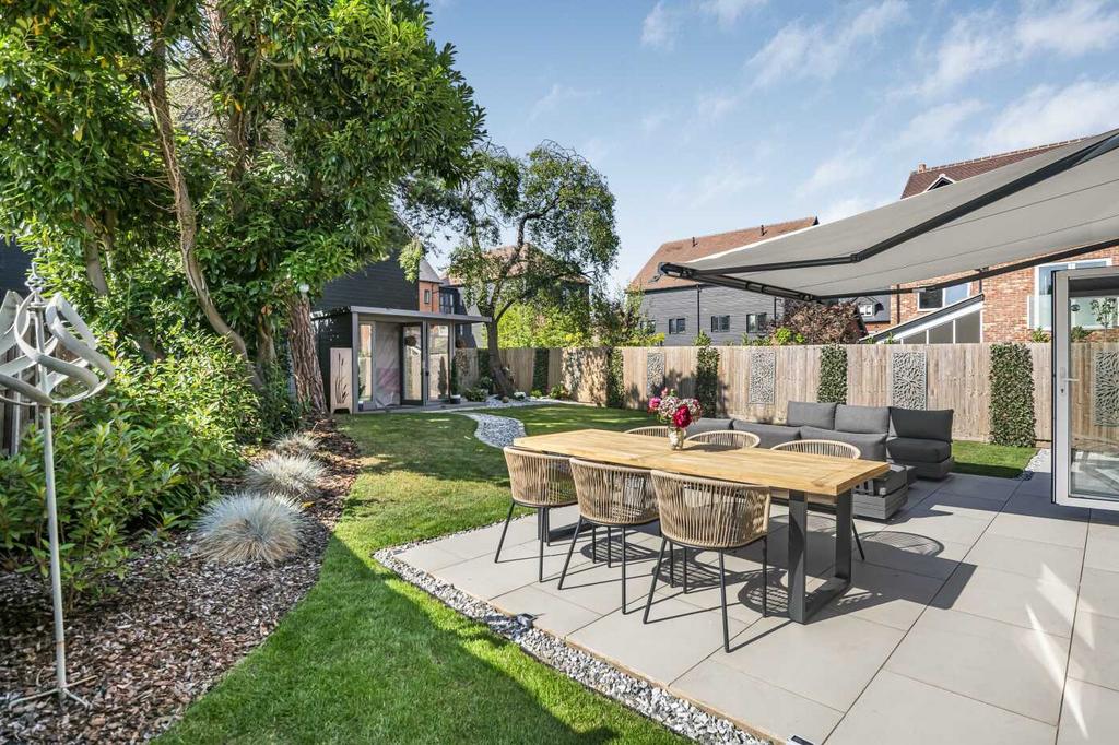 The fully-enclosed rear garden is a real feature of the house. Accessed via side gates, and from bifold doors in the kitchen / dining room, the large patio is tiled in Spanish porcelain, and with its electric awning, provides ample space for shaded al fresco seating and dining. The main garden has been landscaped with mature planting, trees, decorative lighting, and a path which leads to the Summer House. This peaceful purpose-built wooden structure is glazed, and could be used as a home office. Note, there is currently no power supplied to this structure, but it is possible. A separate garden area to the side of the house has been laid to shingle as a 'zen' garden. A door leads into the single garage.