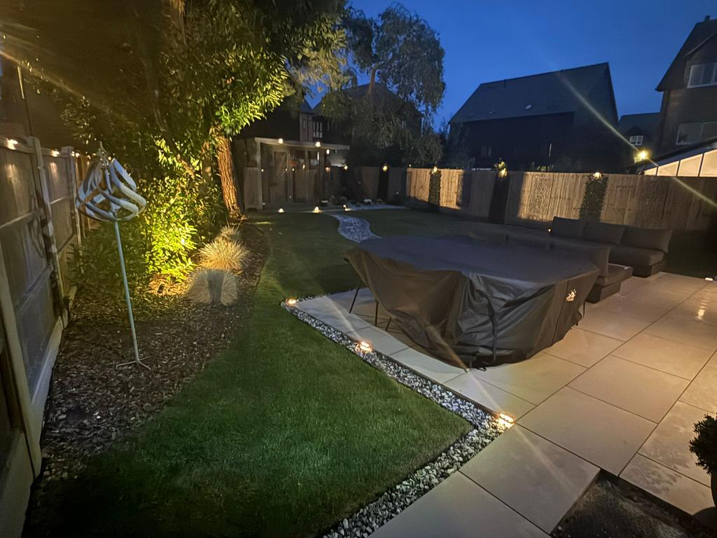The fully-enclosed rear garden is a real feature of the house. Accessed via side gates, and from bifold doors in the kitchen / dining room, the large patio is tiled in Spanish porcelain, and with its electric awning, provides ample space for shaded al fresco seating and dining. The main garden has been landscaped with mature planting, trees, decorative lighting, and a path which leads to the Summer House. This peaceful purpose-built wooden structure is glazed, and could be used as a home office. Note, there is currently no power supplied to this structure, but it is possible. A separate garden area to the side of the house has been laid to shingle as a 'zen' garden. A door leads into the single garage.