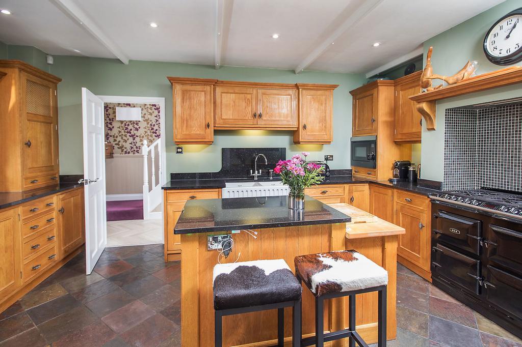 The kitchen is handmade and bespoke fitted with a beautiful range of oak wall and base level units. The quality finish includes granite work surfaces, twin under counter Belfast sink, there is an island unit with built in storage and recycling, there is an AGA 6-4 (6 gas rings and 4 ovens) and there is an integrated washer/dryer and microwave. Ceramic tiled floor. There is a concealed Ideal gas boiler which was installed during 2018 and has been serviced annually, the last service is dated April 2025.