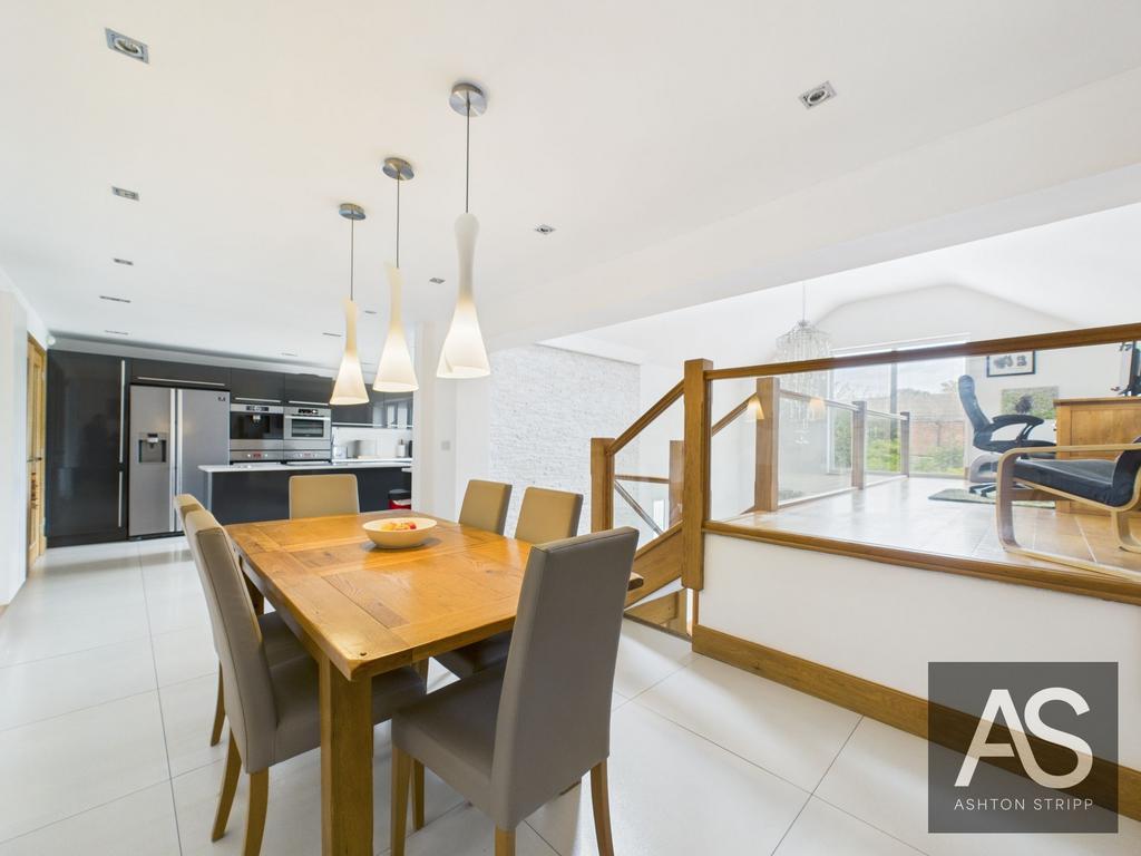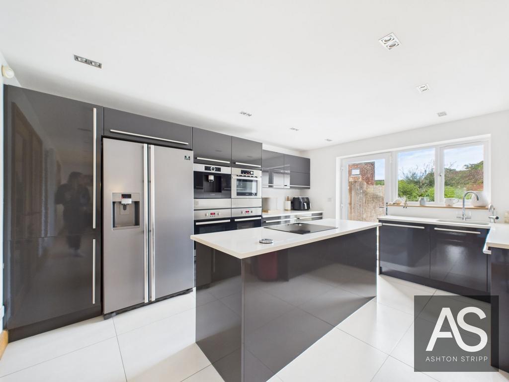 Back through the hallway, oak-framed glazed doors lead into the kitchen, where tiled flooring continues. The kitchen is well laid out with grey wall and base units topped with white quartz worktops, offering a clean and modern finish. At the centre, a quartz-topped island houses an induction hob along with pop-up power and USB points that retract neatly into the surface. A Bosch coffee machine is built in alongside Prima double ovens and a microwave, with proving drawers (for baking), an integrated dishwasher, pull-out larder, and space for an American-style fridge freezer completing the specification. Soft-close pan drawers provide additional practical storage, while the inset stainless steel sink with chrome instant hot tap is set beneath a window overlooking the rear garden — combining ease of use with a well-planned layout.