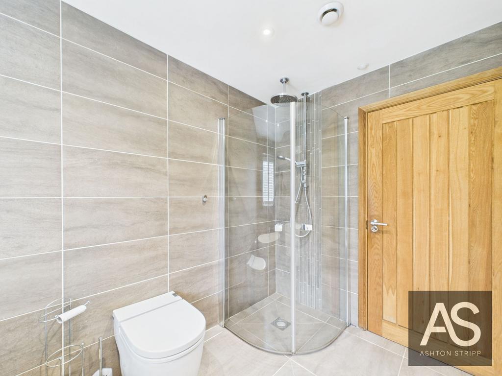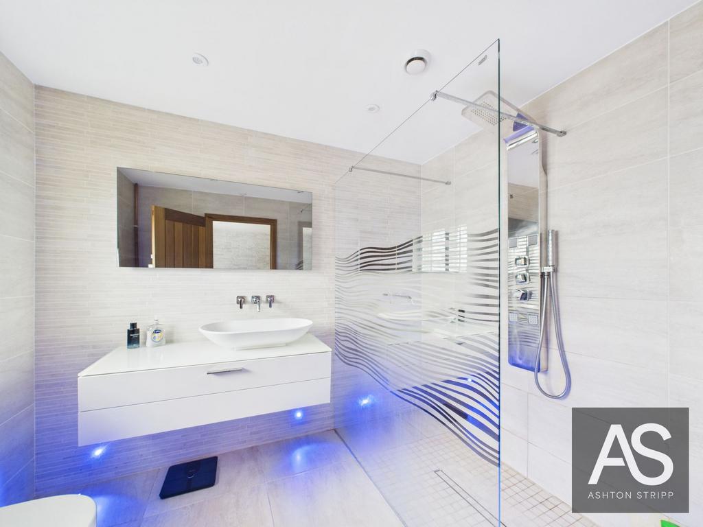 Just before reaching the main bedroom, two integrated wardrobes with oak doors and internal automatic lighting are built into the hall. The principal bedroom sits at the front of the house and offers a generous layout, with cream carpet, fitted shutters and a modern wall-mounted radiator. The en-suite is thoughtfully designed with soft neutral tiling and underfloor heating creating a warm, comfortable finish. A large walk-in shower is fitted with both a fixed rainfall head and versatile handheld attachments, enclosed by a clear glass screen. A sleek vanity unit with an oval countertop basin and mixer tap offers integrated storage, while the concealed-flush WC sits neatly to one side. Discreet ceiling spotlights provide clean illumination, complemented by low-level mood lighting for a softer ambiance. A heated towel rail, extractor fan, and a frosted window with custom shutters complete the space with practical comfort.