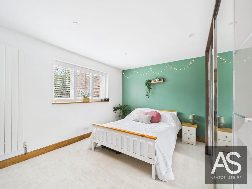 Further along the hallway is a good-sized airing cupboard, followed by a double bedroom overlooking the side garden. It features cream carpet, fitted shutters and recessed lighting — ideal as a guest room, workspace or family bedroom.