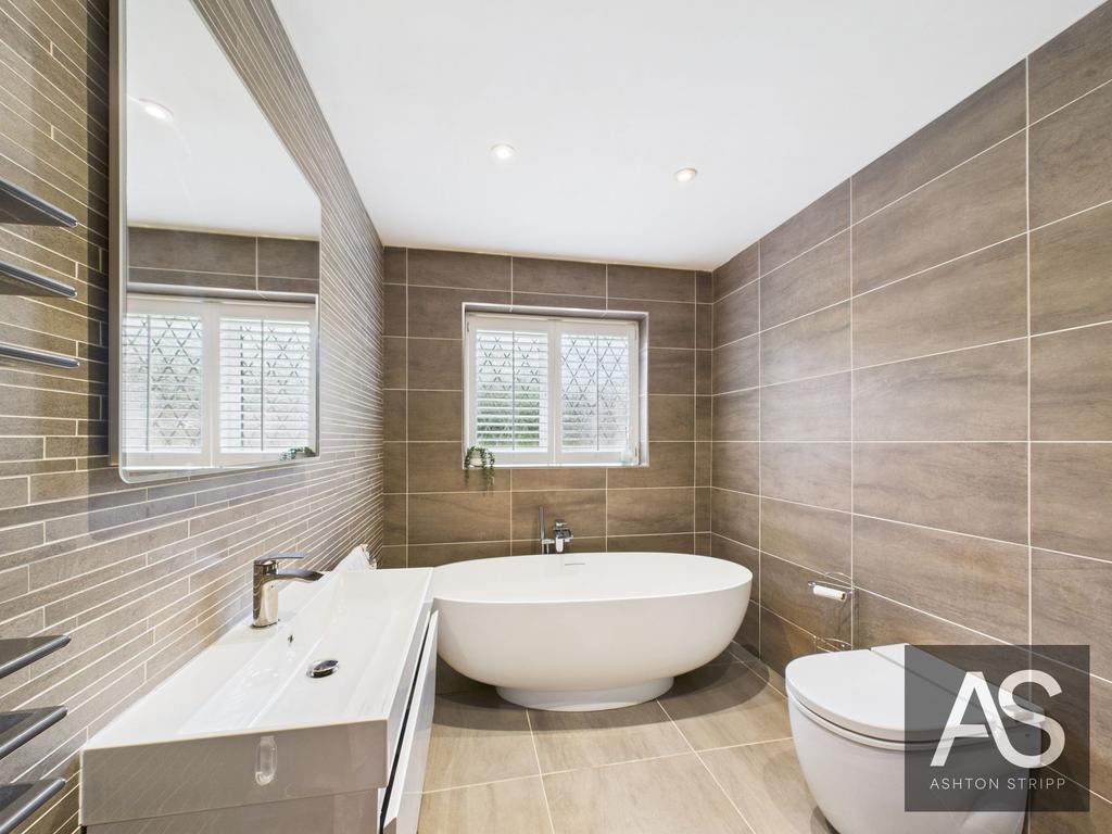 The family bathroom is smartly finished with full-height grey tiling and a well-considered layout. It includes a freestanding, double-ended oval bath with central mixer tap and shower attachment, a concealed-flush electric WC, and a ceramic basin with storage drawer and contemporary mixer tap. A wall-mounted towel rail sits alongside a walk-in shower fitted with both a rainfall head and separate handset, operated via an intuitive start-up control. There's a sensor-lit mirror above the basin, and a double-glazed obscured window with bespoke shutters brings in natural light while maintaining privacy. Recessed ceiling spotlights complete the clean and modern look.