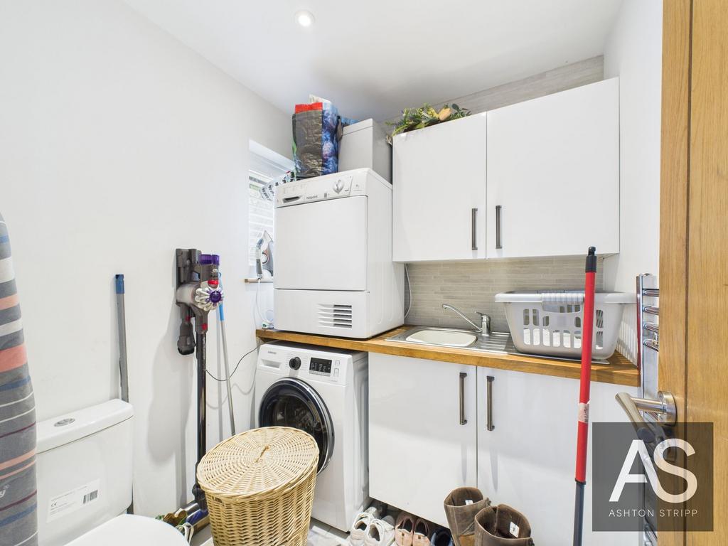 To the left is a well-designed utility room with automatic lighting, oak worktops and white wall and base units. There’s space for a washing machine and tumble dryer, along with a WC (non-electric). This is a practical and neatly tucked-away space for laundry and storage.