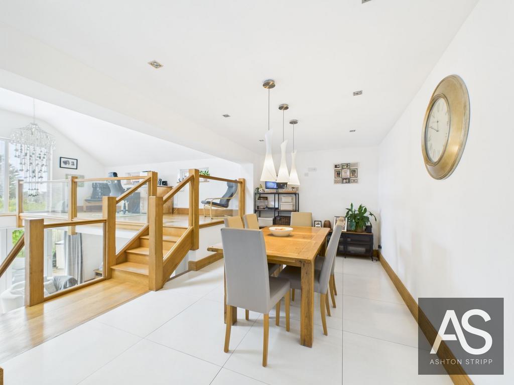 The kitchen flows into the dining area, where a pendant light hangs above the table and oak stairs with glass balustrades lead up to a mezzanine level. Currently used as an office, it’s a bright and flexible space with potential for various uses.