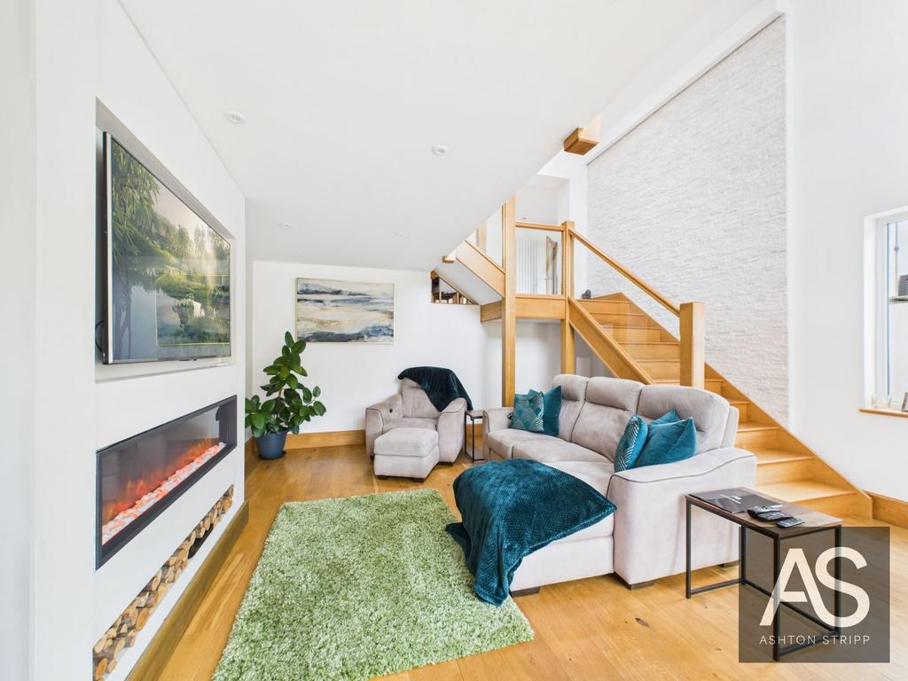 From the dining area, stairs also lead down to the main living room — a striking double-height space with oak flooring, built-in electric fire set into a media wall, and bi-fold doors opening onto the lower terrace. Floor-to-ceiling glazing, a Velux window and feature wall lighting bring in excellent natural light.