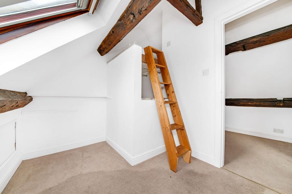 Bedroom three enjoys a great deal of natural light which cascades through the large double glazed skylight window to the rear elevation. The window provides fantastic open aspect views over rooftops. There is exposed timber beams and trusses on display, a useful fitted cupboard for storage and a useful under eaves storage cupboard. There is a ceiling light point, radiator and television point.