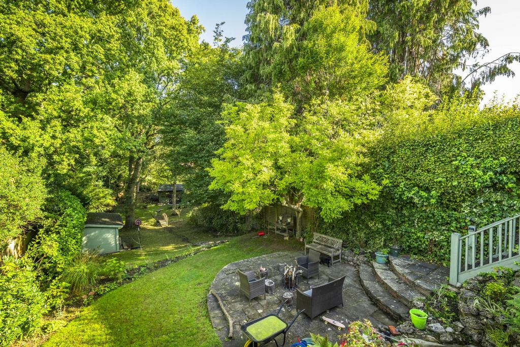 Outside at the rear, a large, decked terrace, perfect for summer dining, stretches across the back of the house providing a perfect vantage point to enjoy the idyllic garden views. Steps lead downwards to wonderful gently sloping tiered sections of lawn, paved terraces and planting all leading towards the rear of the garden covered by a canopy of trees. There is a wooden shed for garden equipment and two bespoke garden studios, both with lighting and electricity providing superb versatile spaces for a gym/games room and home office. The garden is fully enclosed, secluded and secure with high mature hedging and shrubs and fencing, making it ideal for kids and pets.