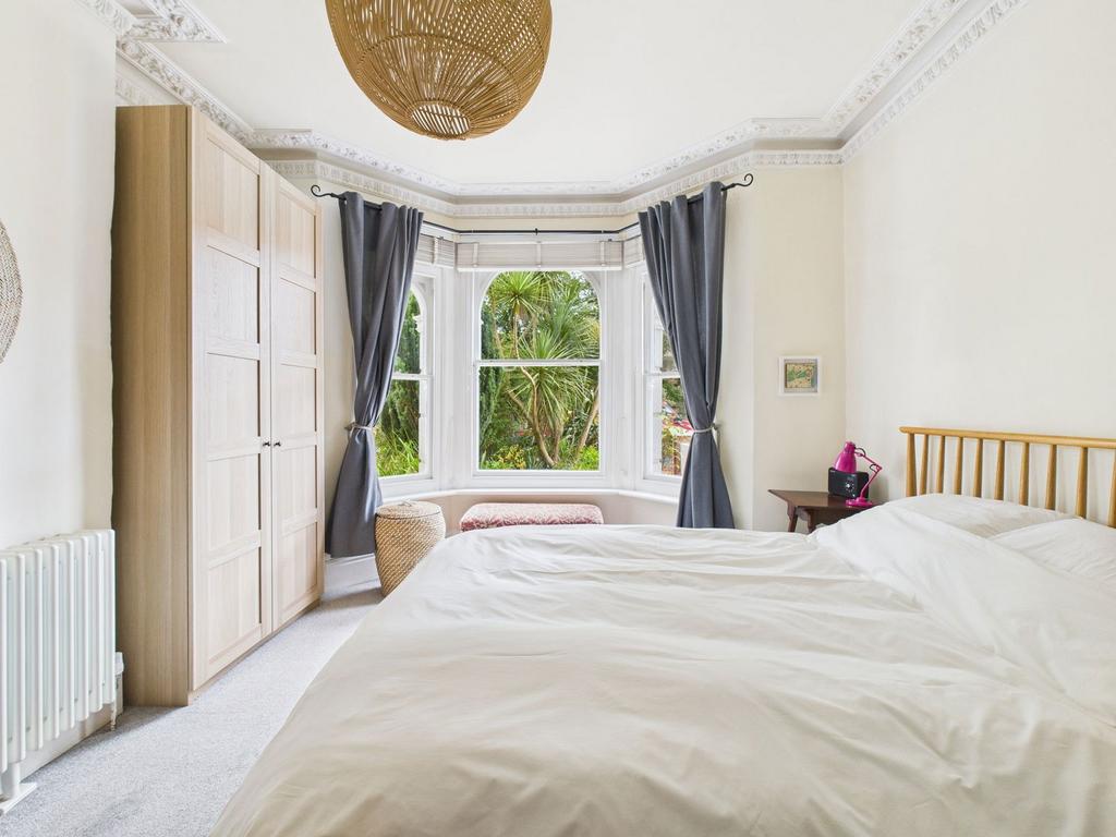 Internal This apartment features its own private covered entrance at the front, leading into a welcoming hallway with ample space for shoe storage and coat hanging. At the front, the spacious main bedroom faces west and measures an impressive 14'6" x 12'0". It easily accommodates a large double bed along with additional freestanding furniture. This bedroom features original ceiling cornicing, which carries through into the porch. The characterful arched windows offer charming views over the mature front garden. Adjacent to the main bedroom is the living and dining area, serving as the central gathering space of the home. Measuring a generous 12'4" x 16'0", this room comfortably fits both seating and dining arrangements. Double-glazed French doors open onto the rear garden, allowing natural morning light to brighten the space. The second bedroom is suitable for a single bed, making it ideal as a child’s room or a dedicated home office. The kitchen is fitted with cream wall and base units, complemented by dark oak-effect laminate worktops that provide a sleek, modern look. Appliances include an integrated gas hob, electric oven, and designated spaces for a washing machine, dishwasher, and fridge freezer. Completing the accommodation, the bathroom offers a bath with an overhead shower, along with a toilet and hand basin.