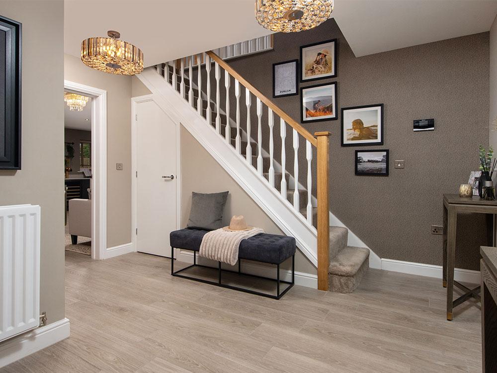 The 5-bedroom Charlton has been designed with flexible living in mind, making it perfect for those who need adaptable spaces. The large L-shaped open plan kitchen/dining/family area is a standout feature, complete with a stylish kitchen island with space for three stools, a dining area that accommodates an eight-seater table, and large bi-folding doors that further expand the living area, making it an excellent space for entertaining. There is also room for a three-seater corner sofa, and the practical utility room offers additional storage space.