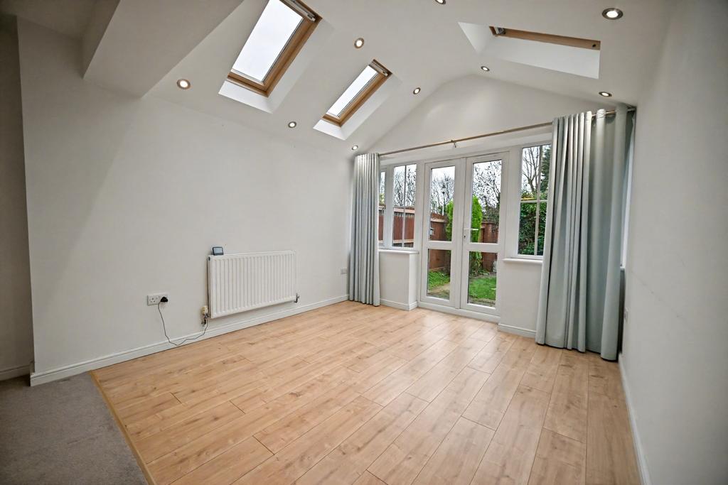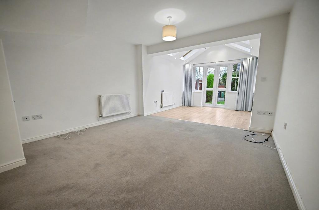 Open Living Room & Dining Area: 24ft (7.34m max) x 12'2'' (3.73m max) Two radiator, built in under stairs storage cupboard, part vaulted ceiling with skylights & recessed ceiling spot lights, LVT flooring at rear and double glazed French doors to rear garden with matching side windows.